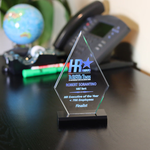 Celebrate exceptional achievements with our remarkable award! Crafted with a distinctive triangle shape and featuring an elegant ebony acrylic base, this award is designed to leave a lasting impression. Available in either full-color print or laser engraved!