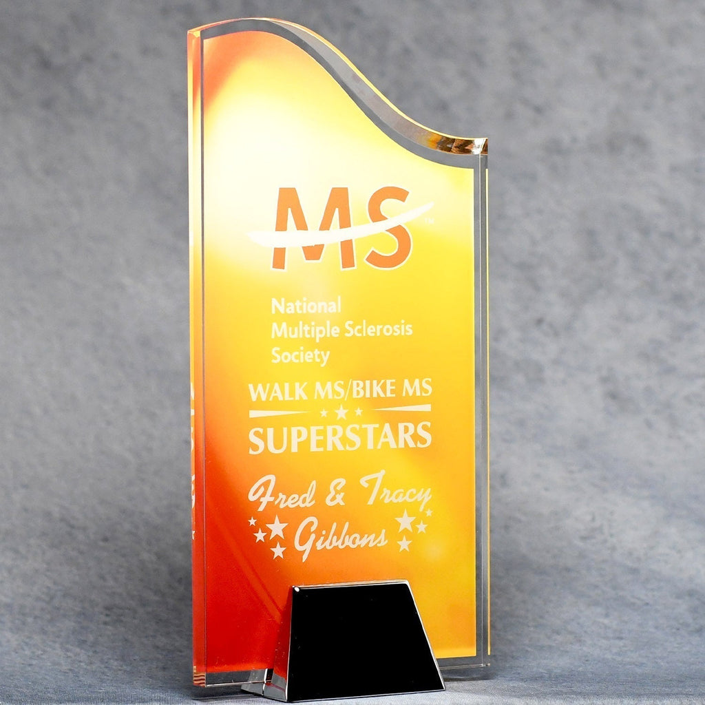 Crafted from the finest acrylic and elegantly cradled in a solid silver finish metal base, it exudes quality and style. Personalize it with your logo or a custom message, creating a truly unique and eye-catching piece that will undoubtedly make a statement in any environment or setting.