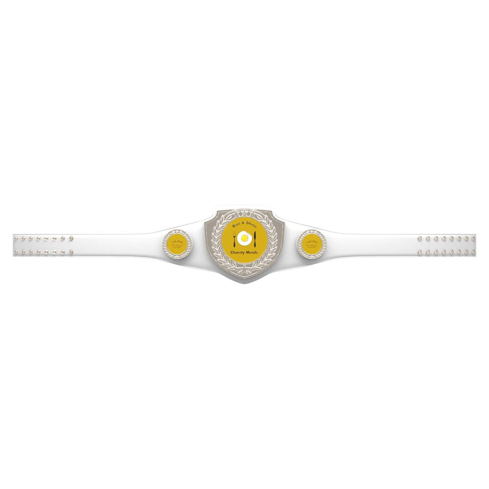 Our very popular Adult Championship belt is 52 inches long and made of vegan leather. Boasting 3 imprint areas measuring 8" x 7" on the front and 3" on each side, this championship belt is sure to make an impact in a big way. Available in Black or White, this awards comes if a velvet presentation pouch.