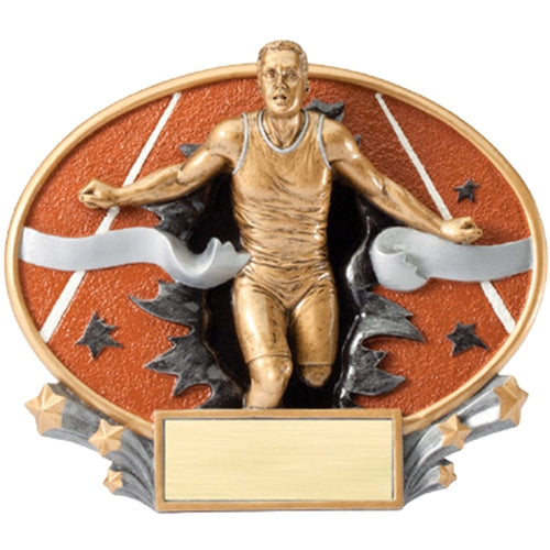 The 3-D life-like action scene BURSTS THRU the colored sports background. The dimensional Hand Crafted "SilverStone" Sculptured Sports Ovals are perfect for Free-Standing or as a Wall Plaque. The pewter-finished resin oval with gold highlights and a full-color sports icon provides something completely different for your upcoming award event. A rectangular framed area is available for personalization.
