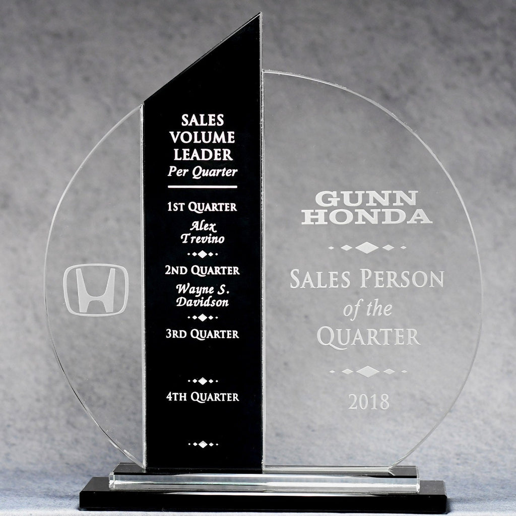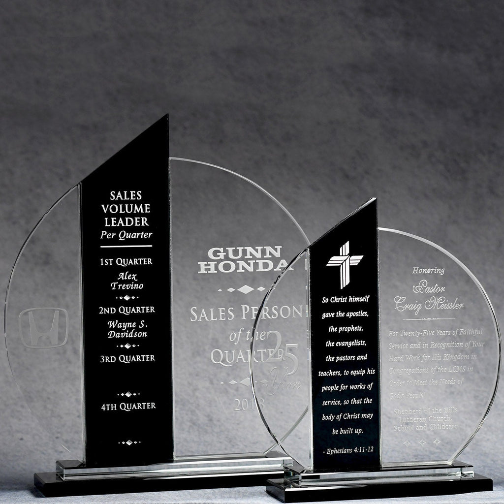 Featuring an elegant mix of black and clear crystal, this award is ideal for any special occasion. Have your logo and text hand etched onto the crystal for a one-of-a-kind look that will make it stand out in any setting.