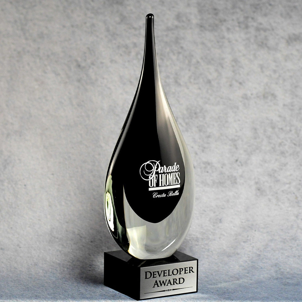Standing at 15 inches tall, this hand-crafted art glass teardrop is a unique and stunning award. The black and clear glass details blend on a sleek black glass base for an eye-catching design.