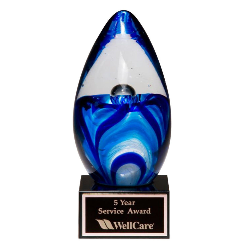 Elegant and eye-catching, the Blue Art Glass Award is a stunning way to honor creativity, achievement, or appreciation. Featuring a graceful swirl of blue suspended in clear glass, this egg-shaped piece is mounted on a sleek black glass base with an engraved metal plate included. Each award is handcrafted, making every piece a one-of-a-kind expression of recognition.