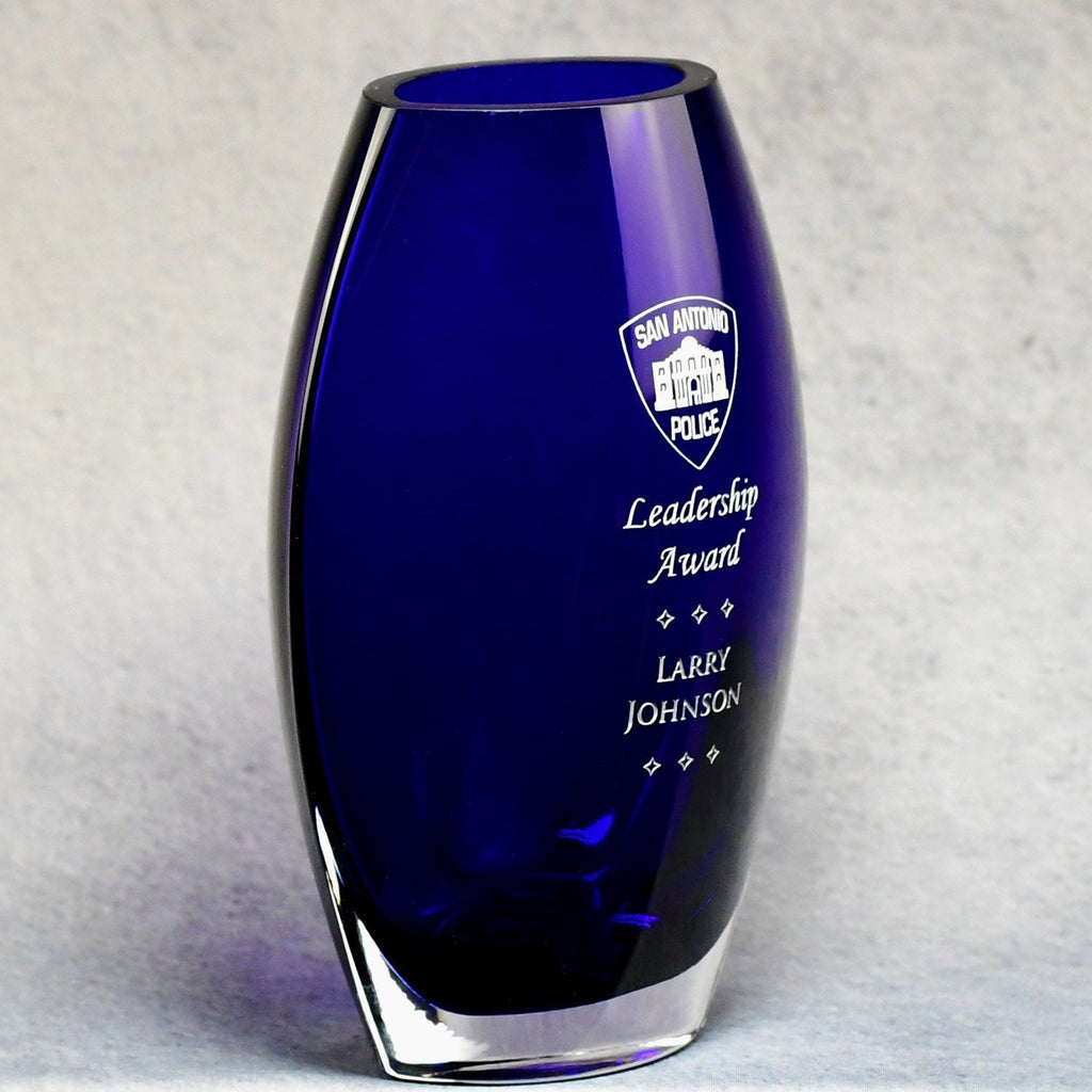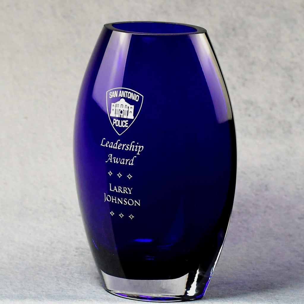 Instantly draw attention to the special occasion or awardee with this stunning Cobalt Blue Vase Award. The magical crystal gleams and refracts light, accentuating its lovely shape. A perfect symbol of appreciation for any occasion!