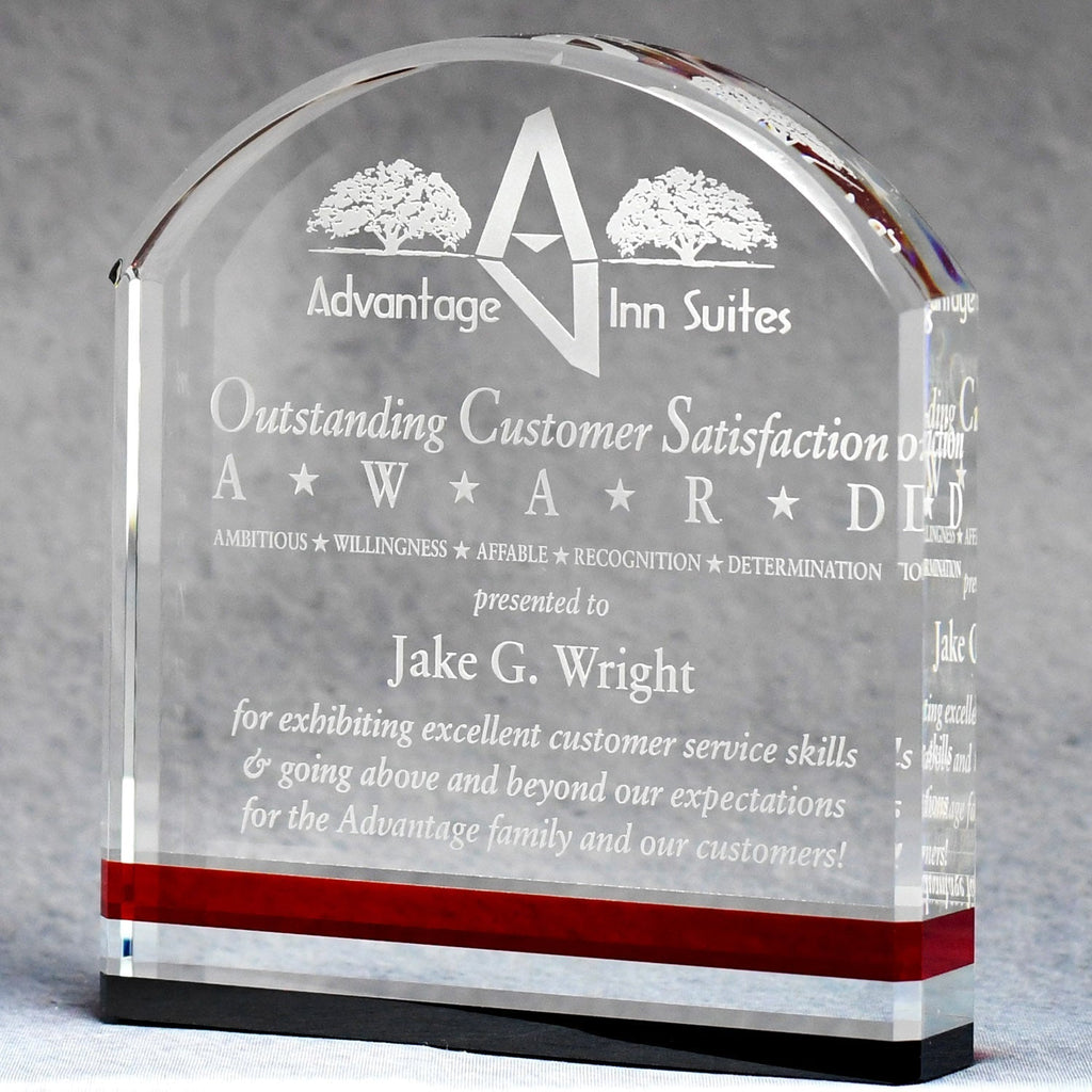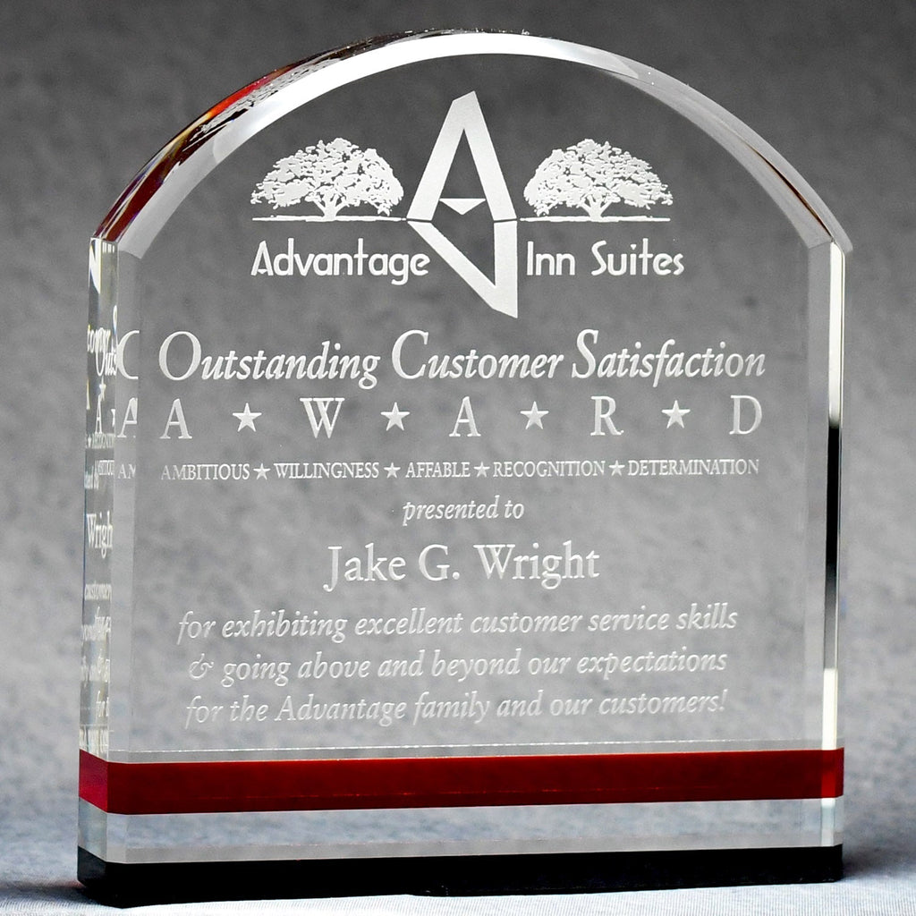 Showcase your achievements with this awe-inspiring, unique arched crystal award! Featuring a black and red accent design on premium designed crystal, it's sure to be the envy of everyone.