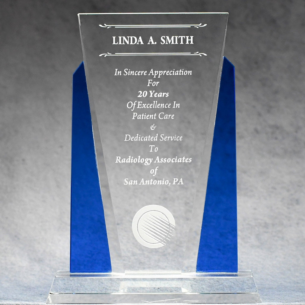 - Crystal clear panel - The eye-catching clarity of the crystal-clear panel rising between two beautiful blue pillars will ensure the recipient's special moment of accomplishment is truly unforgettable. For an extra personal touch, add a unique logo or monogram.