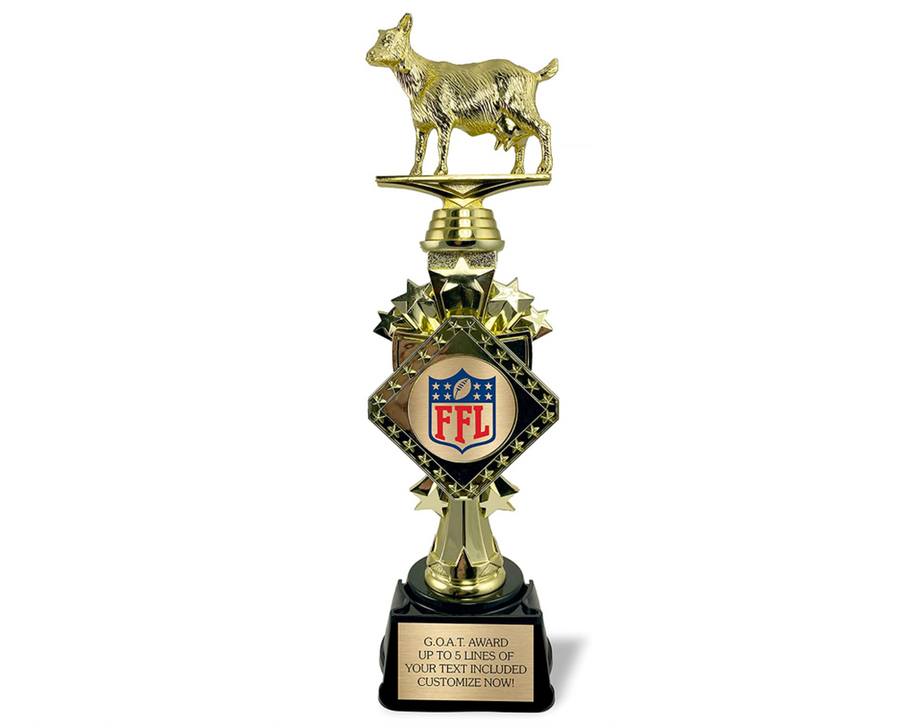Crown your league champion with the ultimate Fantasy Football Trophy – The G.O.A.T.! Standing 13 inches tall, this impressive award features the iconic goat figurine atop a sleek base, making it a perfect tribute to the greatest of all time. Customize the engraved plate with the winner’s name, league name, and a personal message, with up to five lines included to make the recognition truly memorable.