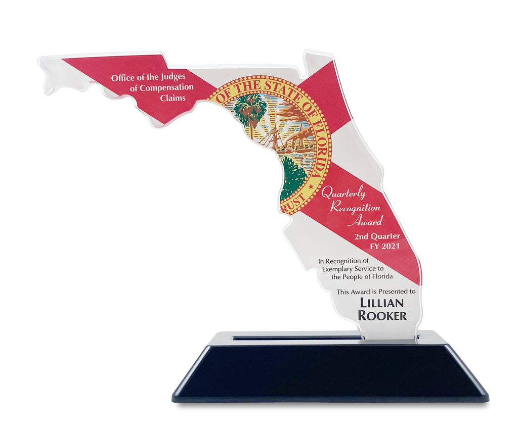 Celebrate Florida pride with the Florida Shaped Acrylic Award featuring a vibrant full-color state flag background. This distinctive piece beautifully showcases your custom text atop the iconic Sunshine State silhouette, making it a perfect tribute for local achievements, organizations, or special events.