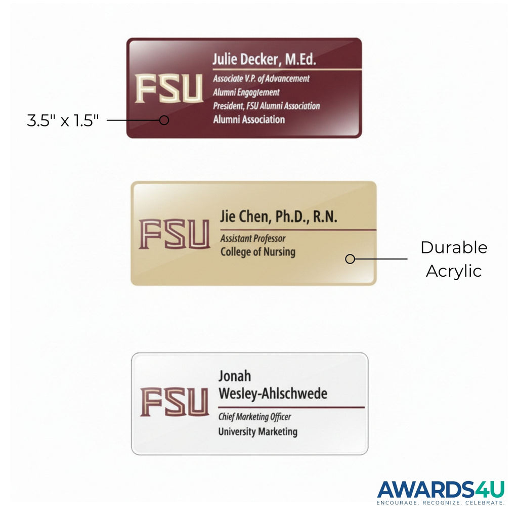 Proudly showcase your Florida State University affiliation with this custom FSU Employee Nametag, designed for everyday professionalism and comfortable wear.