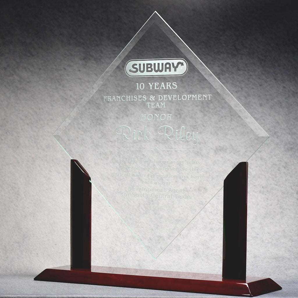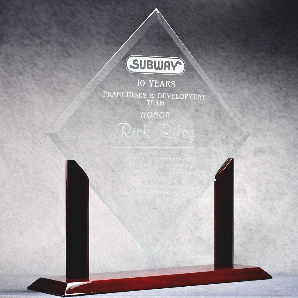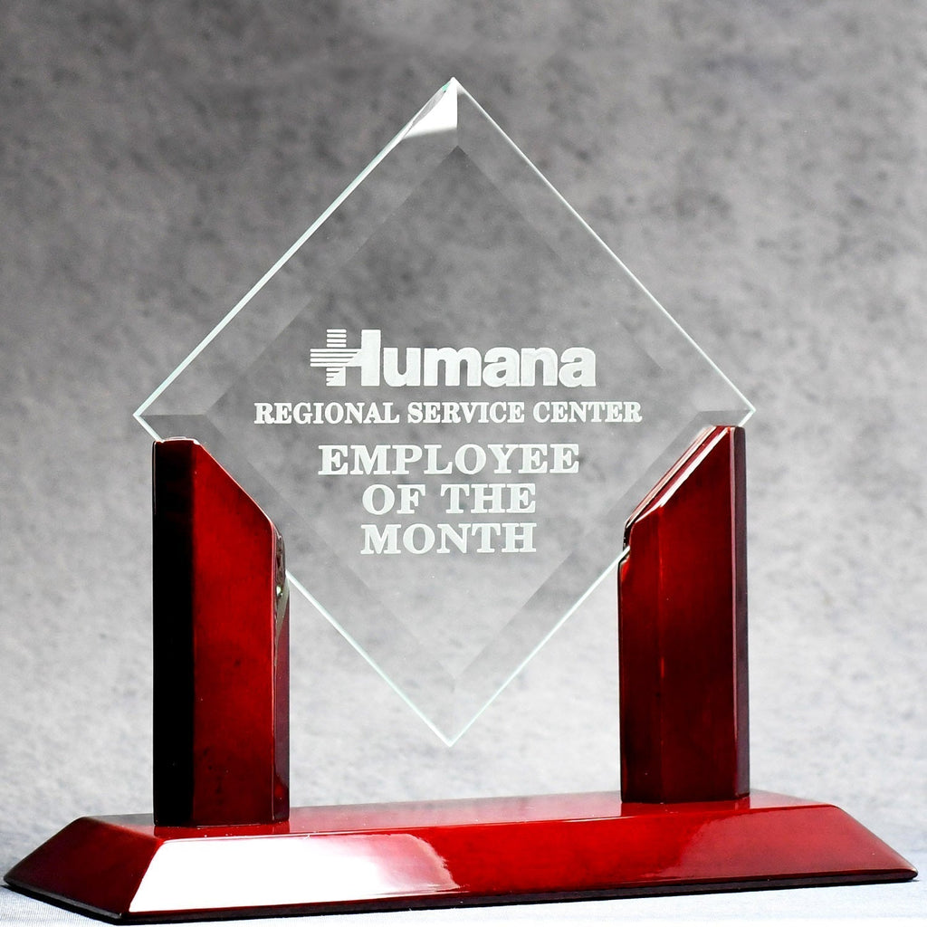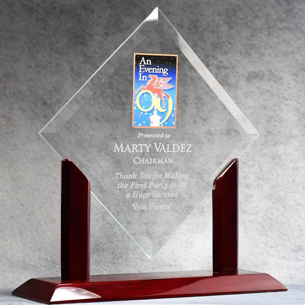 Appreciate the effort of your peers and award them with a unique gift that will be remembered for years to come. This stunning trophy features a hand-crafted Jade crystal with soft green highlights. It sits atop a rosewood-finished piano wood base.