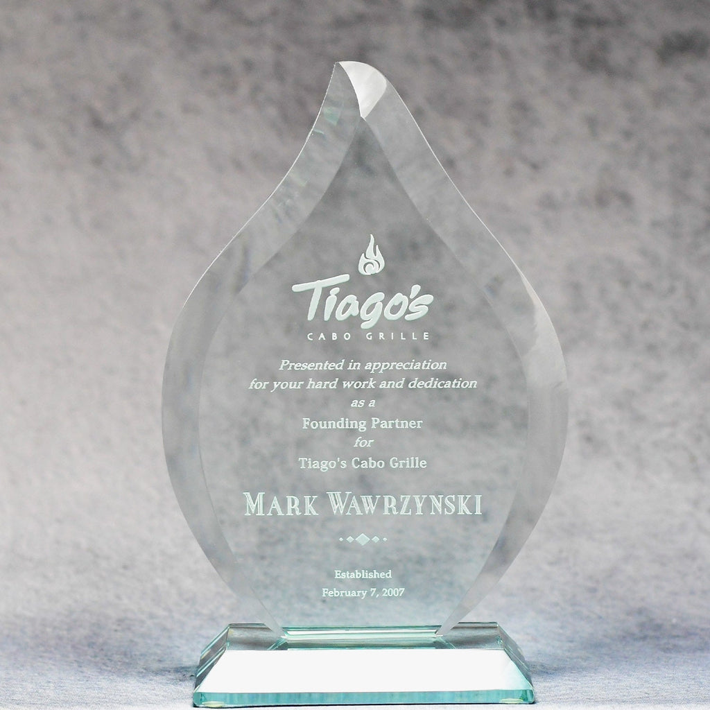 - Etching adds depth - Enhance the award's beauty with an engraved message or logo on one side along the elongated 8” flame stem. The etching adds depth and dimension that increases its sophistication even further.