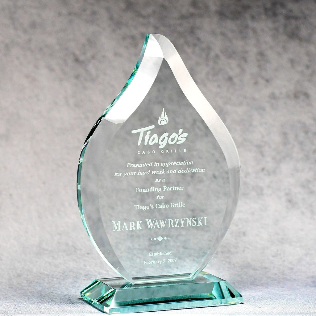 Celebrate and recognize your top achievers with this beautiful jade crystal flame award. With hand-cut beveled edges and striking green highlights, it's sure to create a lasting impression.