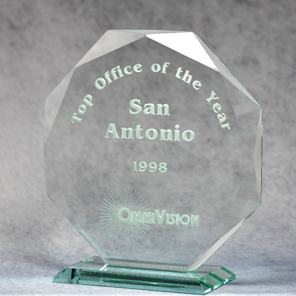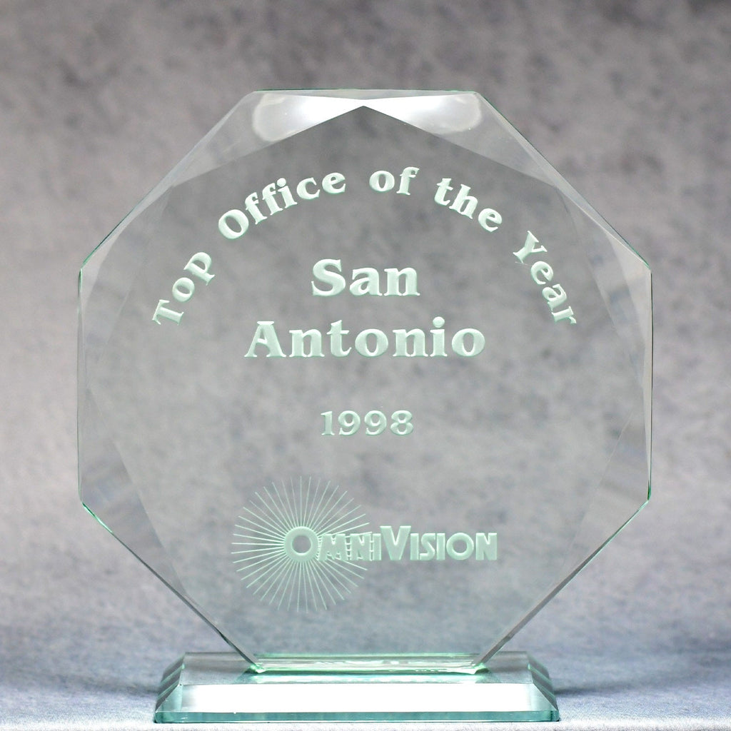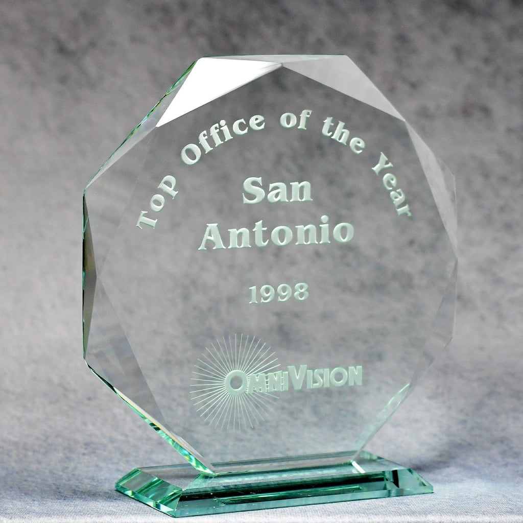 The Jade Crystal Octagon Award is a stunning way to recognize excellence. Its hand-cut beveled edges give the award its unique look, and detailed reverse etching adds depth and dimension to the honor.