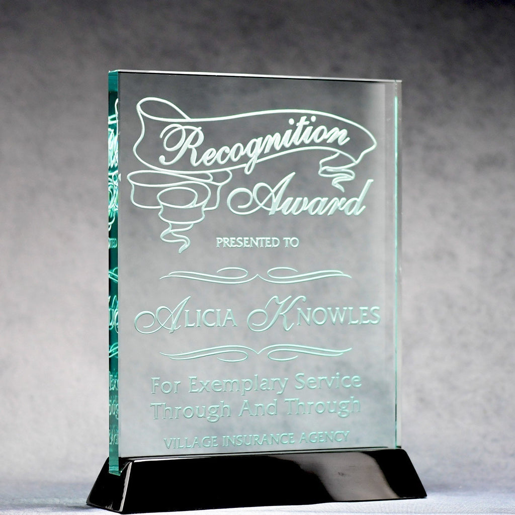 This Black Piano Base features a hefty jade glass piece combined with a dramatic and elegant piano-finish ebony base. This would make a memorable award or gift.