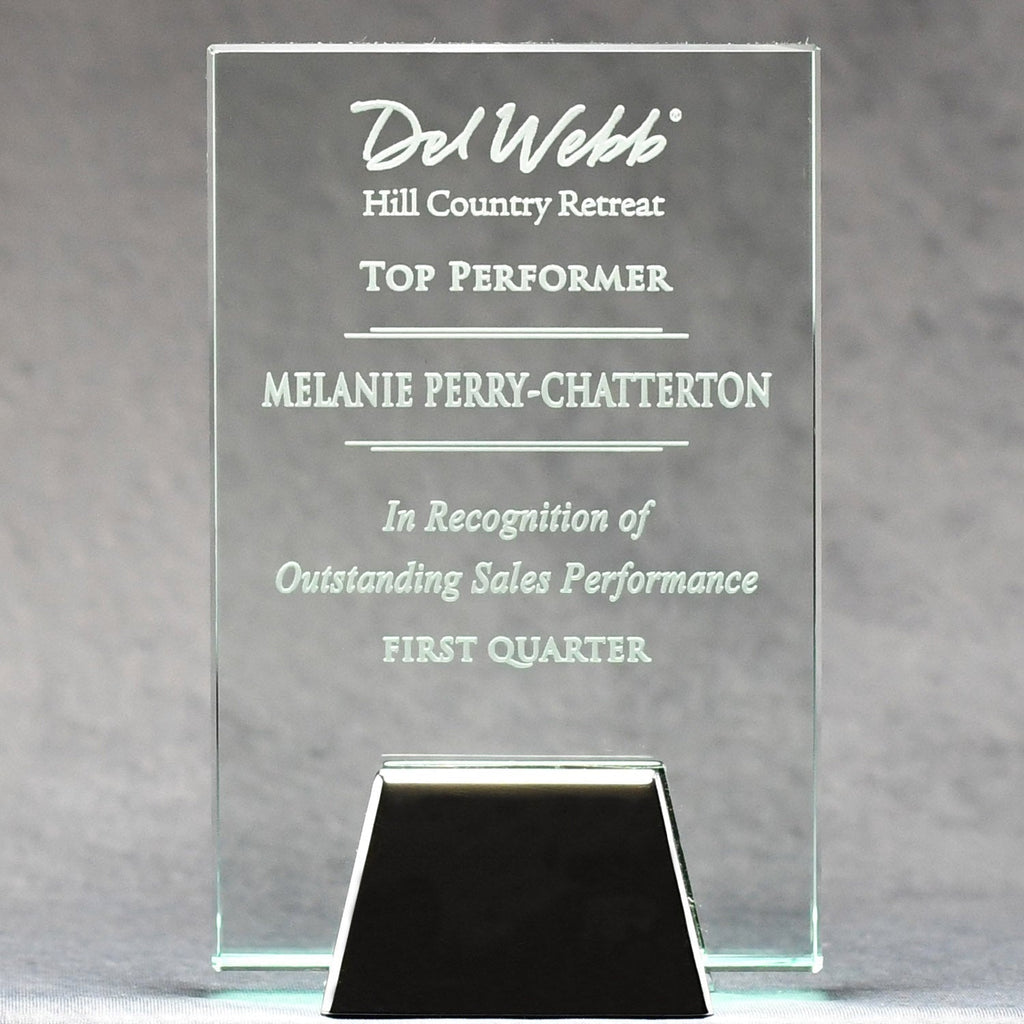 The sleek metal base securely cradles this rectangular Jade Glass. An office desk or bookcase would be an ideal setting for this unpretentious, stately award.