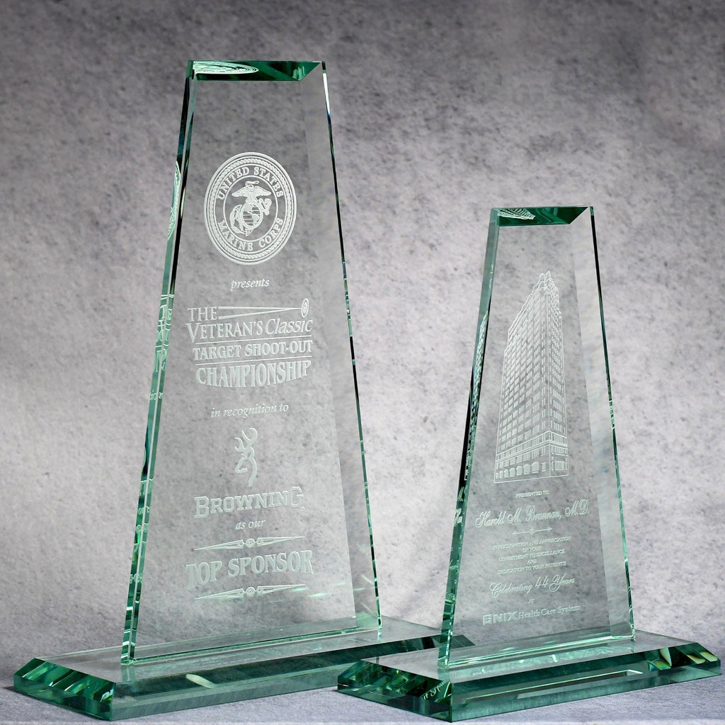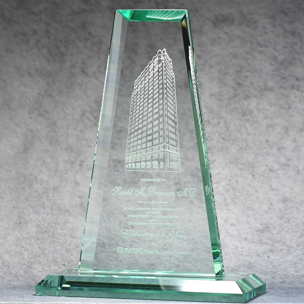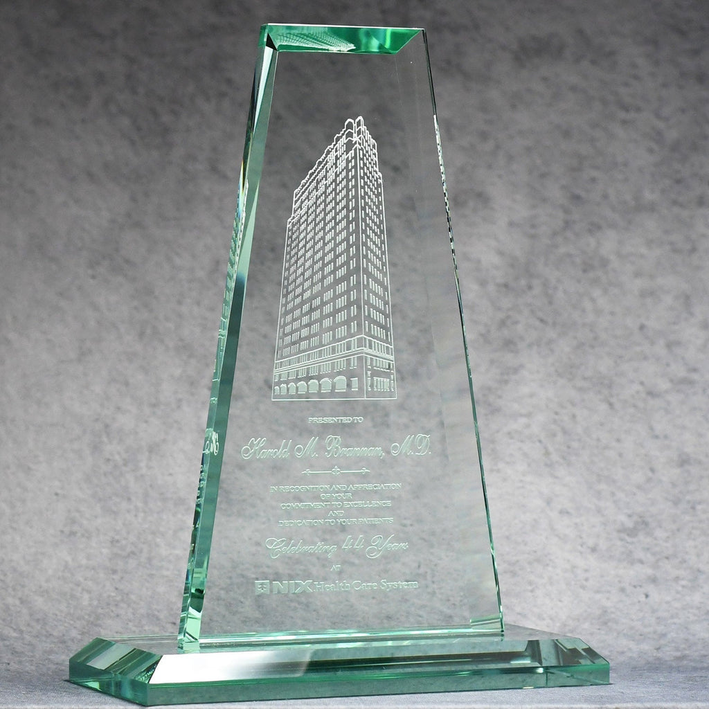 This exquisite jade crystal tower award sets the perfect backdrop for your personalized message or logo. Showcase your organization's success with an elegant and contemporary beveled jade crystal masterpiece!
