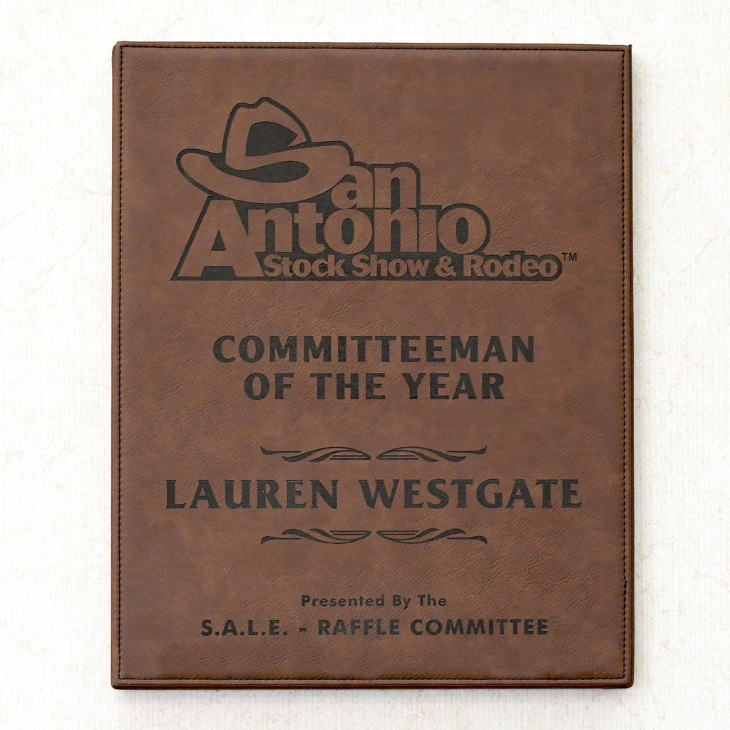 The perfect awards plaque for any environment! This leatherette plaque is made of processed leather. You get the look and feel of genuine leather with durability.