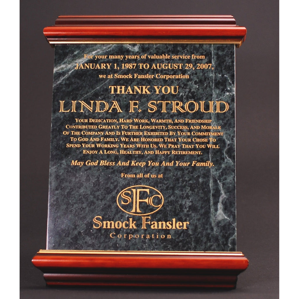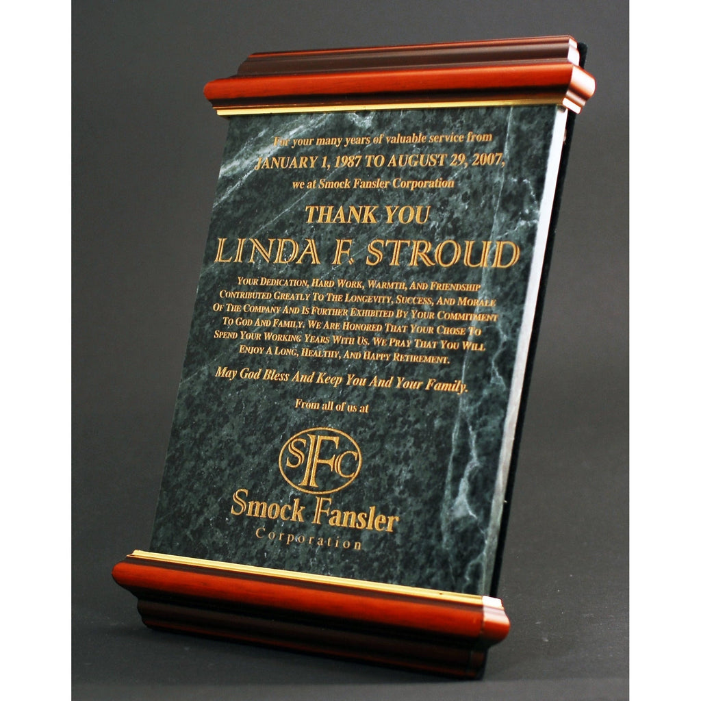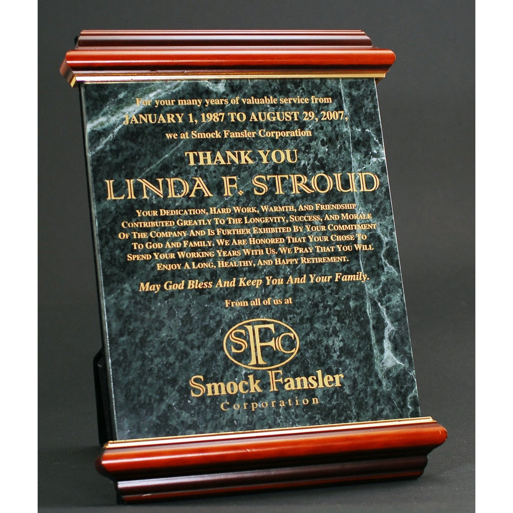 This sophisticated award features Mahogany Wood caps showcasing a rich Black Marble Panel for etching. With two available sizes, it is an innovative way to honor the Employee of the Month and Employee of the Year for your company. Add custom text to create the perfect presentation gift to recognize significant donations to an organization. Include your company logo to honor a lifetime of service. Let us help you bring your vision to life!