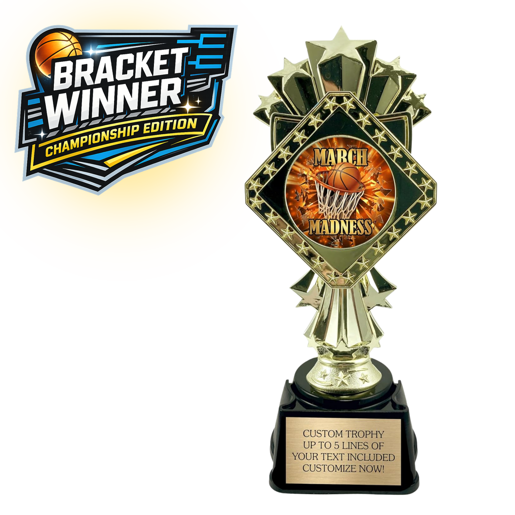 This March Basketball Logo trophy is designed to celebrate the winner of your office pool, family challenge, or competitive bracket group.