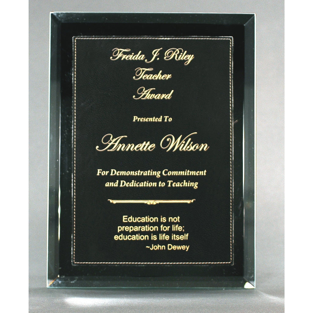 This 11x14 beautiful mirrored plaque with a black leatherette plate is a unique design. When lasered the wording comes through an elegant gold for the utmost in visual impact. We can also apply a direct color imprint to really make this award pop! This Elegant appearance works well in a home or office.