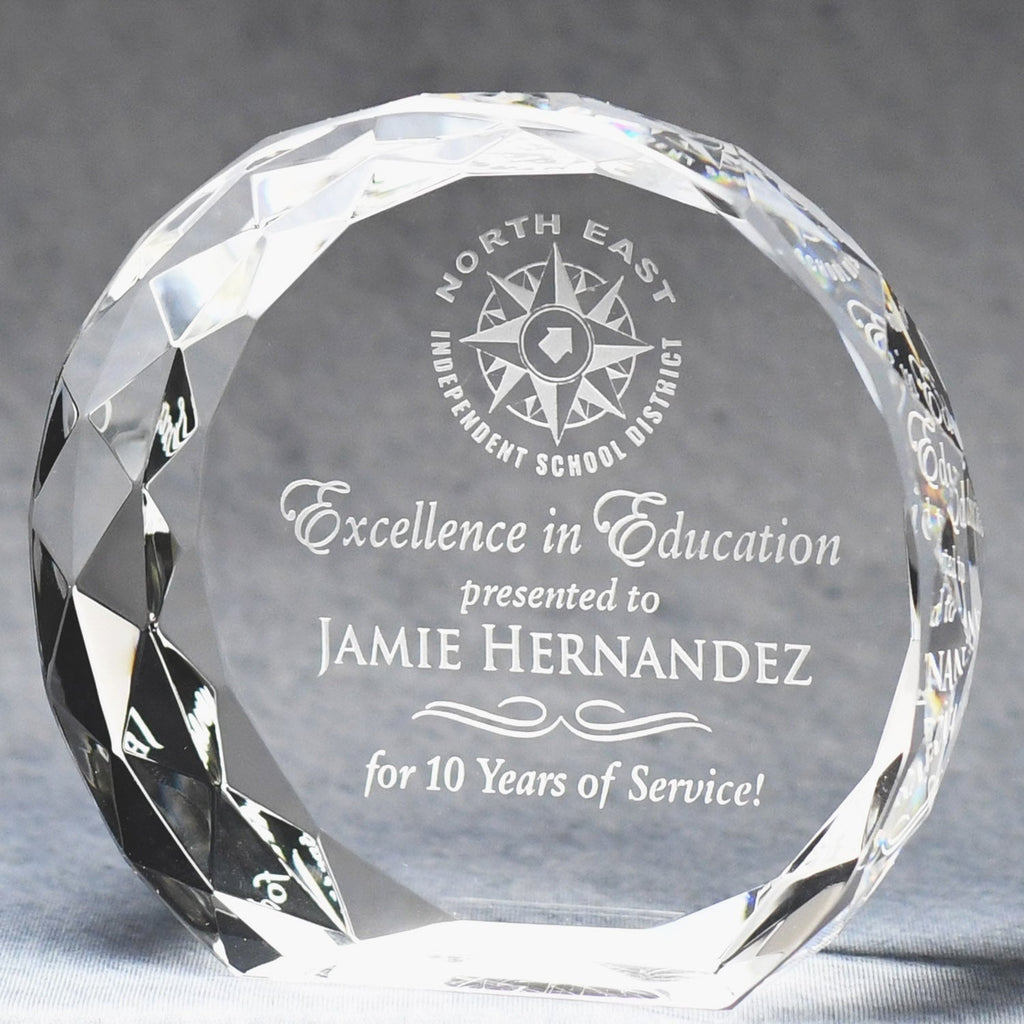 This is an eye-catching crystal award. Its multifaceted surface and thickness create subtle rainbows of light that will bring a sparkle to any space.