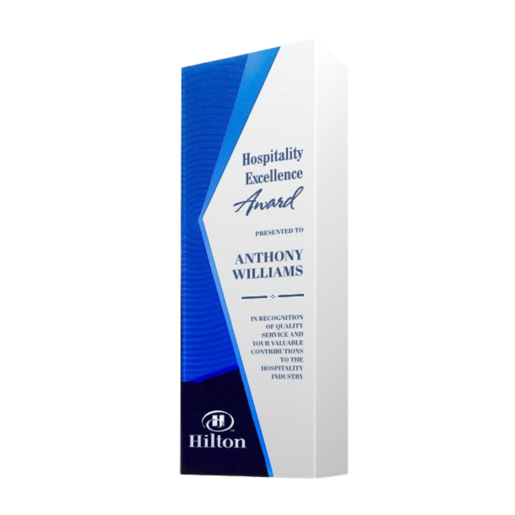 Honor excellence with this sophisticated arrow-inspired column award, featuring clean geometric lines and a modern design that blends vibrant colored epoxy resin with contrasting white polystone.