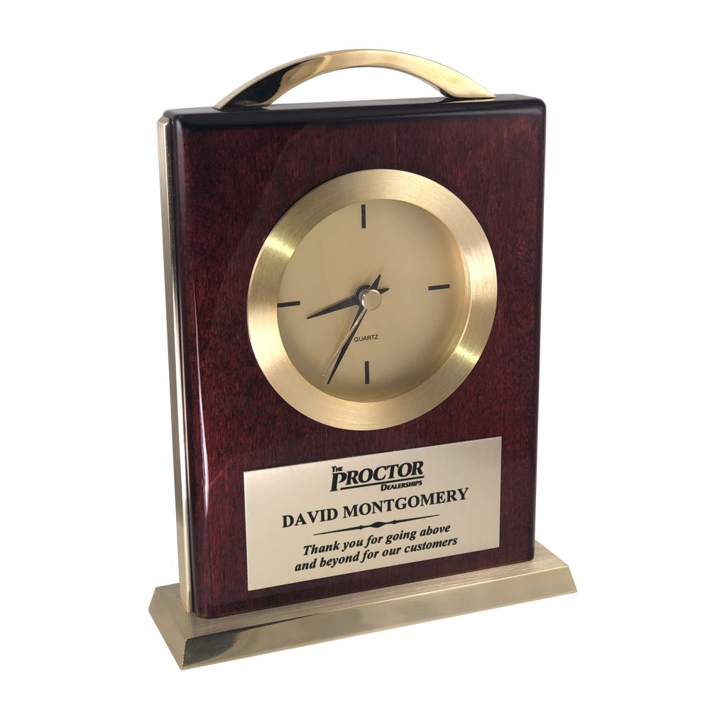 Blend function and style with the Rosewood Desk Clock with Brass Accents. Featuring a rich piano finish rosewood body, elegant brass accents, and a stylized arch design, this clock offers timeless appeal. The gold-tone clock face adds a classic touch, while the included gold plate can be personalized with up to four lines of engraving for a meaningful gift or award.