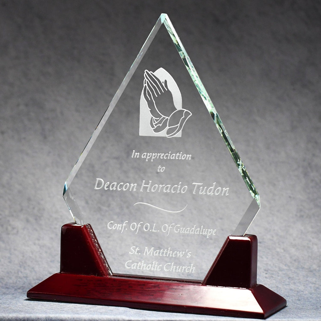 Show off your stellar accomplishments with this stunning clear crystal diamond set in a rosewood base. These sharp, bright, and multifaceted crystals will make sure they never forget your achievements and successes.