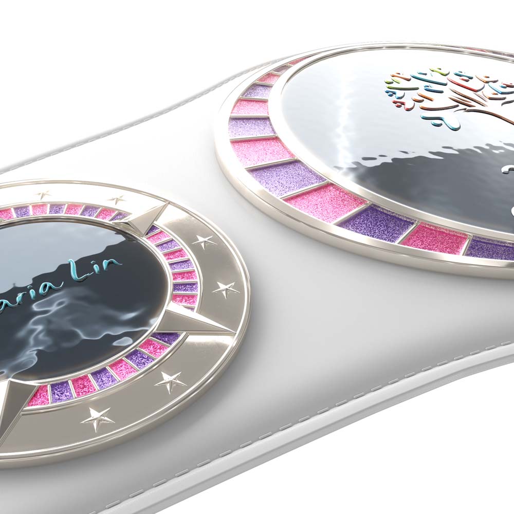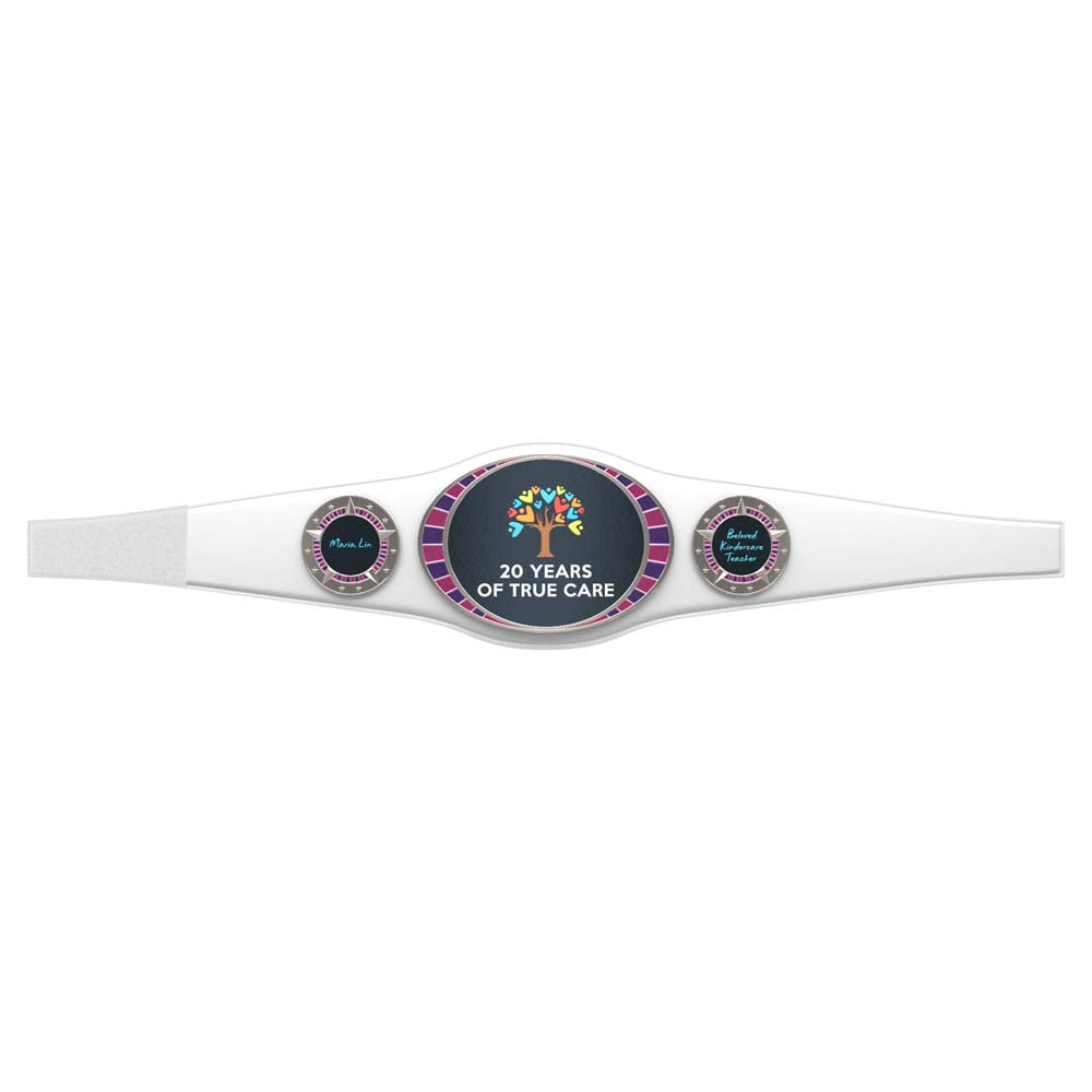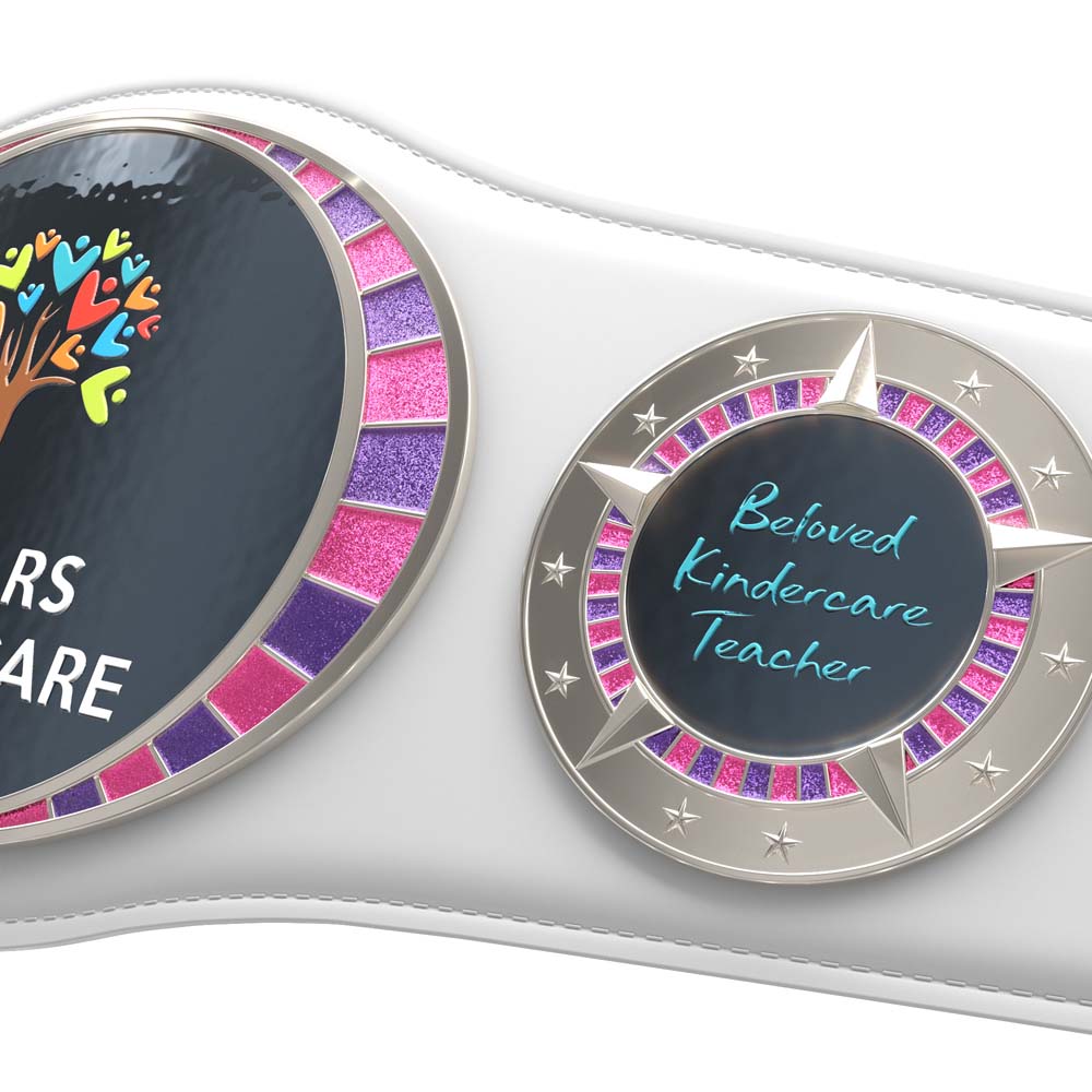Big Bang for your buck. Our new Youth Champion belts are sized for the big winner with a smaller size. The genuine vegan leather belt features an easily adjusted Velcro closure. The large 8 1/2" x 6" brightly finished metal oval plate features dazzling glitter enamel and is complemented by two 3 1/4" round side plates. Belt comes complete with a black velvet pouch for the perfect presentation.